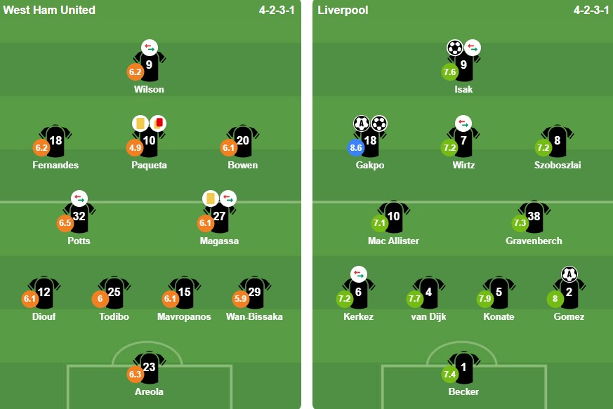 Sau bàn thua, West Ham dồn toàn lực tấn công. Những pha bóng của Bowen, Paqueta hay Fuellkrug liên tục đặt hàng thủ Liverpool vào tình trạng cảnh giác cao độ. Đáng chú ý, Lucas Paqueta nhận hai thẻ vàng liên tiếp và bị truất quyền thi đấu ở phút 84, khiến The Hammers càng khó khăn hơn trong nỗ lực tìm bàn gỡ.