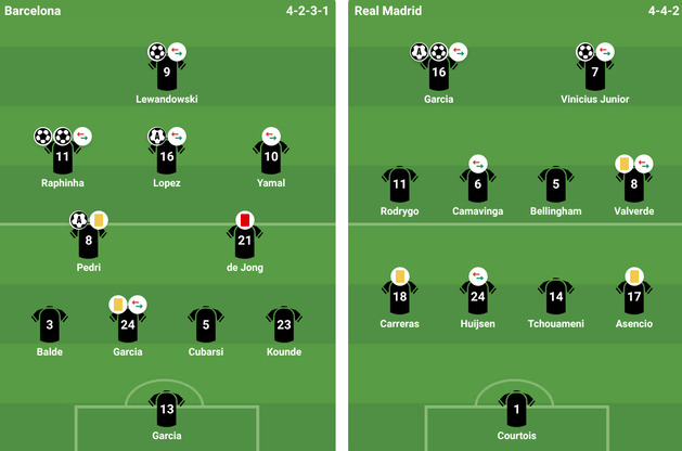 Bước sang hiệp hai, thế trận giằng co được duy trì khi cả hai chiến lược gia đều tung vào sân những quân bài chiến thuật quan trọng nhằm thay đổi cục diện. Kylian Mbappe được kỳ vọng sẽ mang lại sự đột biến cho Real Madrid, nhưng hệ thống phòng ngự của Barca đã vận hành cực kỳ tập trung dưới sự chỉ huy của Pau Cubarsi.