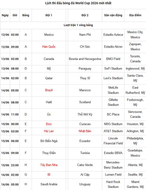 Giải đấu sẽ chính thức khởi tranh bằng trận mở màn giữa chủ nhà Mexico và Nam Phi vào lúc 02:00 rạng sáng ngày 12/06/2026 trên chảo lửa Azteca.