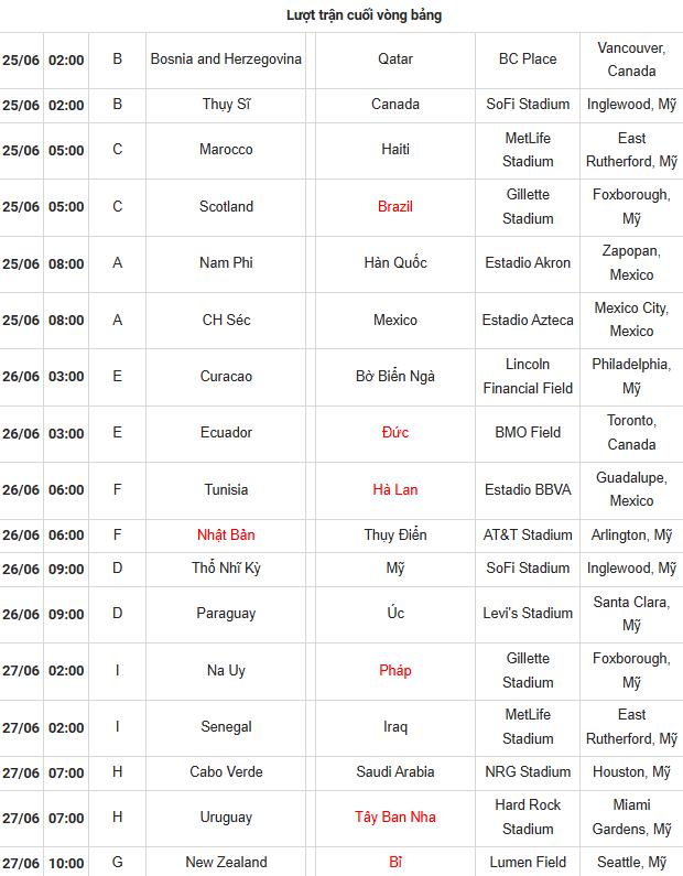 Lượt trận vòng bảng sẽ kéo dài liên tục đến ngày 28/06. Vòng knock-out căng thẳng bắt đầu từ ngày 29/06, và mọi dồn nén sẽ bùng nổ tại trận Chung kết vĩ đại diễn ra vào lúc 02:00 sáng ngày 20/07/2026 trên sân vận động MetLife, Mỹ.